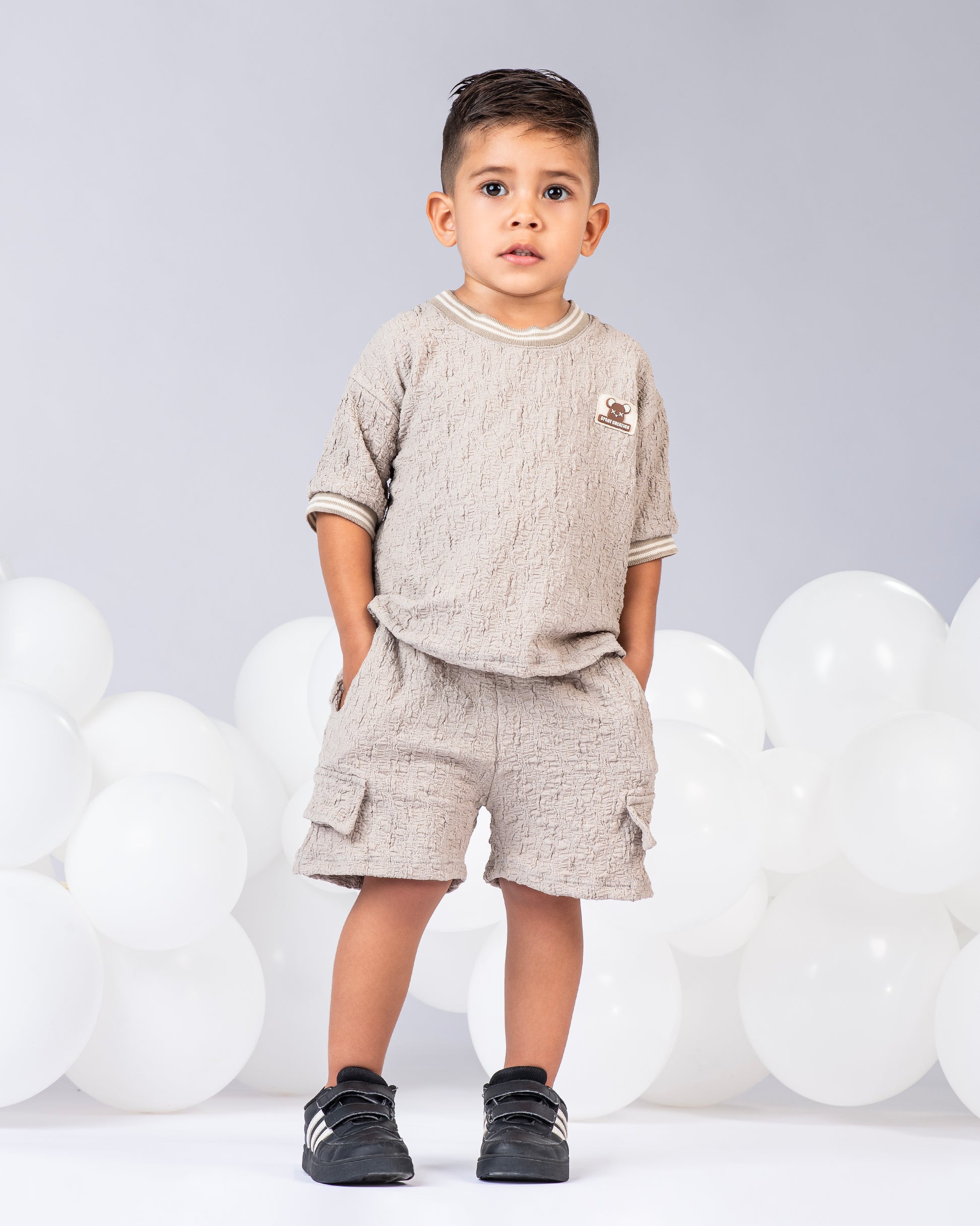 Conjunto infantil en tela texturizada, compuesto por camiseta oversize y bermuda con bolsillos laterales tipo cargo. Su diseño fresco y cómodo lo hace ideal para los días cálidos, mientras que el tono neutro aporta un estilo moderno y versátil, perfecto para combinar con tenis o sandalias y mantener a los peques con un look relajado pero con mucho estilo.